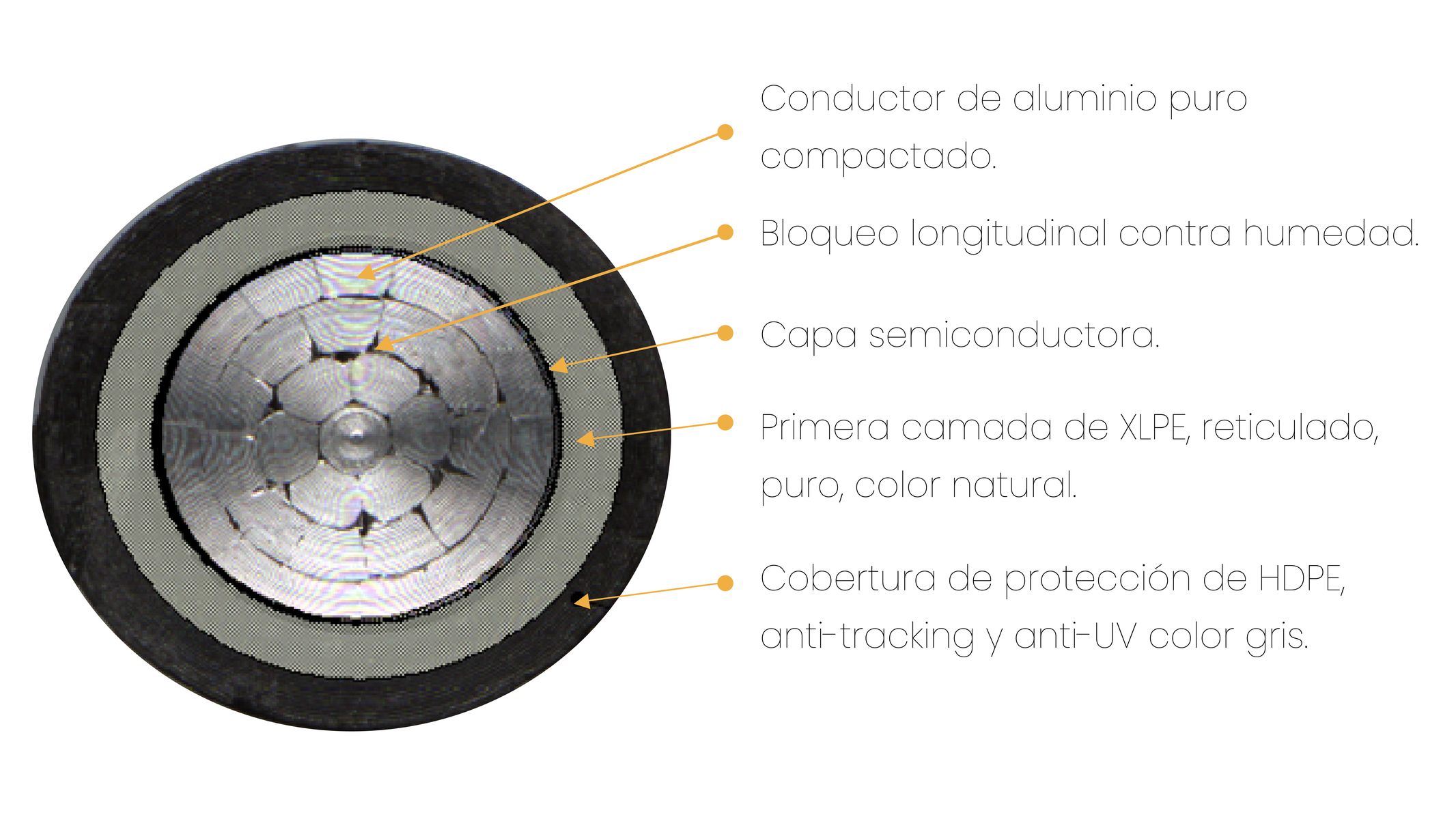 • 1. Conductor: Aluminio desnudo, aleación 1350, encordado circular compactado (Clase 2) bloqueado contra penetración longitudinal del agua.